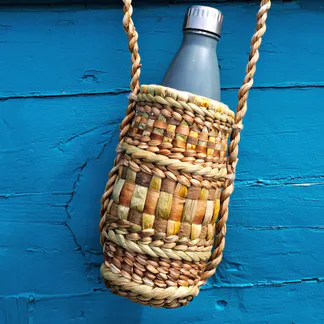 Jeanette Gray is a woman who loves to weave the nature around her. The woven water bottle holder features leaves from lilies, rush and red hot pokers and many more.