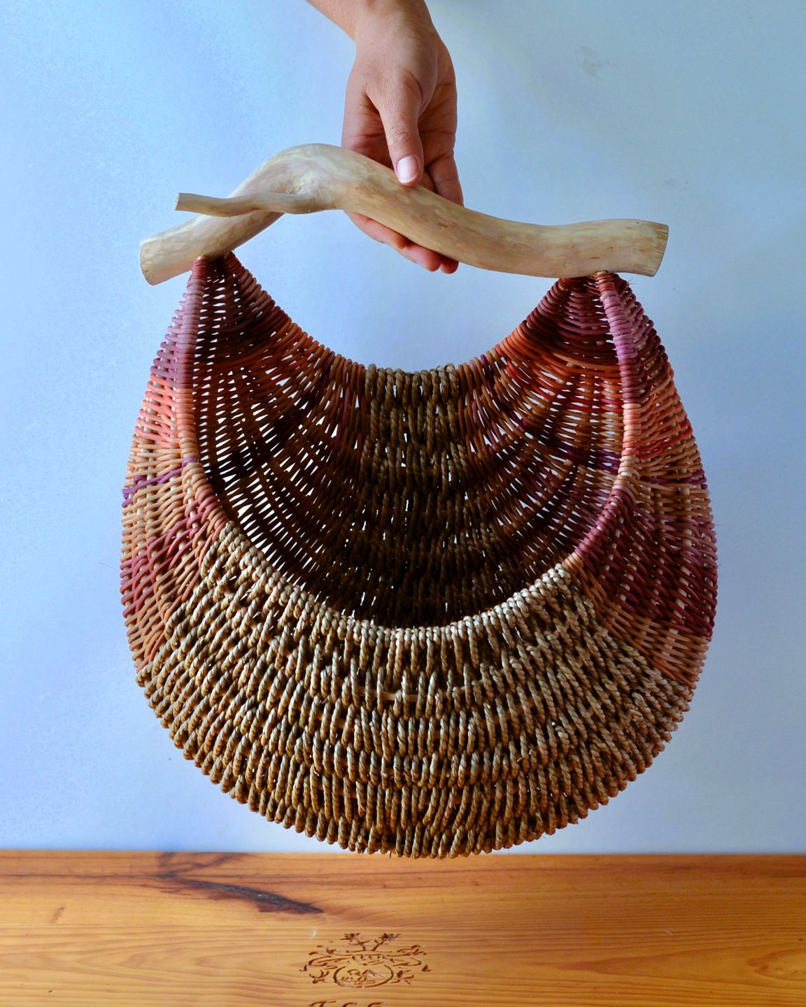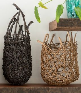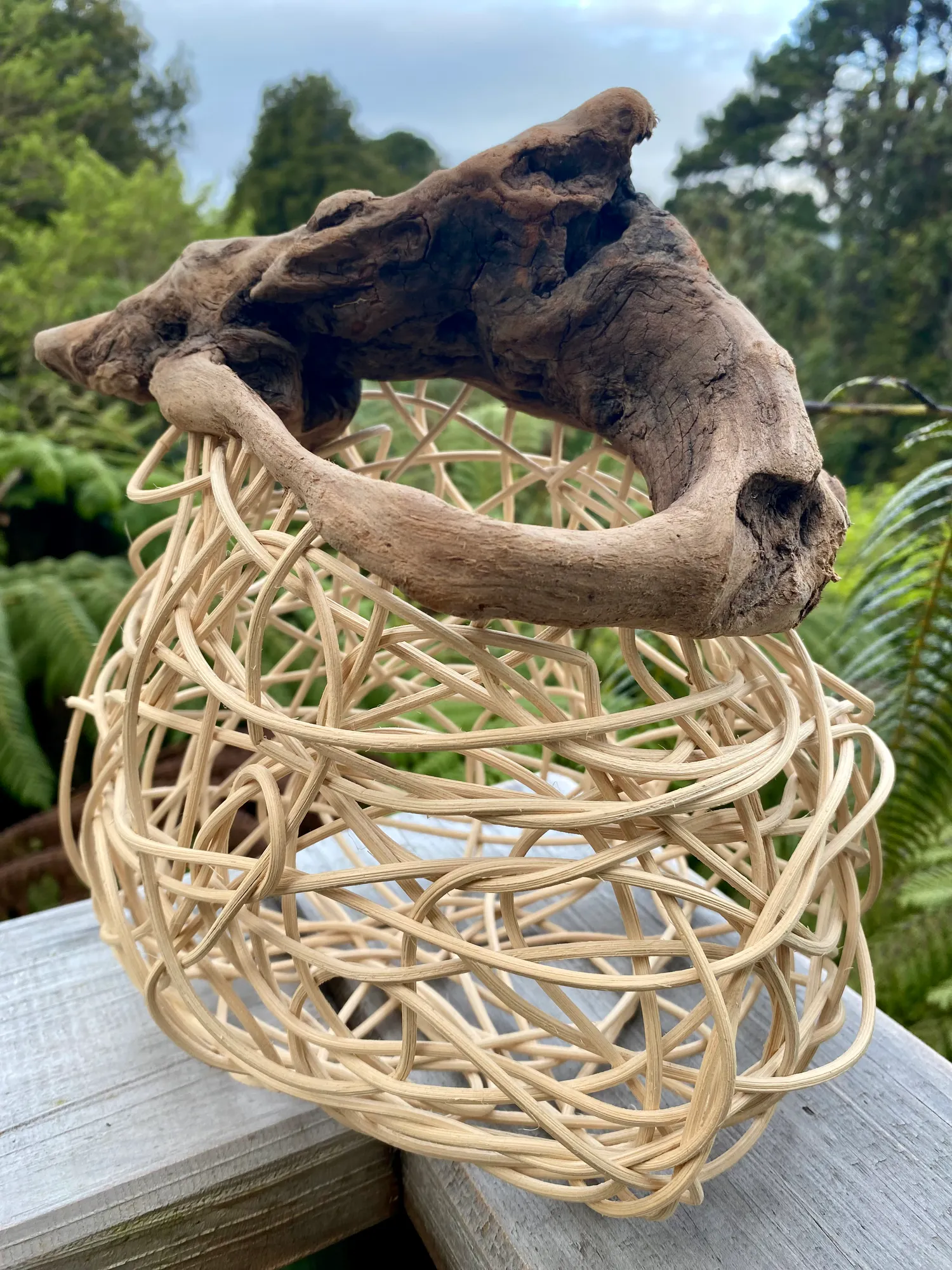 Create stunning random weave baskets with cane and driftwood rims. Additional embellishments such as feathers or buttons or other weaving materials are all welcome.
